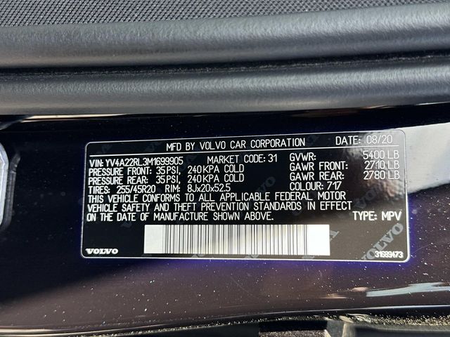 AWD, AWD, 12V Power Outlet, Luggage Area, 14 Speakers, 360 Degree Surroundview Camera, 4-Wheel Disc Brakes, ABS brakes, Advanced Package, Air Conditioning, Air Quality with Advanced Air Cleaner, Alloy wheels, AM/FM radio: SiriusXM, Anti-whiplash front head restraints, Apple CarPlay/Android Auto, Auto High-beam Headlights, Auto-dimming door mirrors, Auto-dimming Rear-View mirror, Automatic temperature control, Brake assist, Bumpers: body-color, Cargo Tray, Climate Package, Compass, Cruise control, Delay-off headlights, Driver door bin, Driver vanity mirror, Dual front impact airbags, Dual front side impact airbags, Electronic Stability Control, Emergency communication system: Volvo On-Call w/4 year subscription, Exterior Parking Camera Rear, Four wheel independent suspension, Front anti-roll bar, Front Bucket Seats, Front Center Armrest, Front dual zone A/C, Front fog lights, Front reading lights, Fully automatic headlights, Garage door transmitter: HomeLink, Genuine wood console insert, Genuine wood dashboard insert, Graphical Head-Up Display, harman/kardon® Speakers, Heated & Ventilated Front Bucket Seats, Heated door mirrors, Heated front seats, Heated Rear Seats, Heated Steering Wheel, Heated Windshield Wiper Blades, Illuminated entry, Inductive Charging For Smart Phone, Knee airbag, Leather Shift Knob, Low tire pressure warning, Memory seat, Mud Flaps, Navigation system: Sensus Navigation, Occupant sensing airbag, Outside temperature display, Overhead airbag, Panic alarm, Park Assist Pilot, Passenger door bin, Passenger vanity mirror, Perforated Nappa Leather Upholstery, Pilot Assist Driver Assistance System, Power door mirrors, Power driver seat, Power Liftgate, Power moonroof, Power passenger seat, Power steering, Power windows, Premium audio system: Sensus Connect, Protection Package, Radio data system, Radio: harman/kardon Premium Audio System, Rain sensing wipers, Rear air conditioning, Rear anti-roll bar, Rear dual zone A/C, Rear fog lights, Rear reading lights, Rear seat center armrest, Rear window defroster, Rear window wiper, Remote keyless entry, Rubber Floor Mats, Security system, Split folding rear seat, Spoiler, Steering wheel mounted audio controls, Tachometer, Telescoping steering wheel, Tilt steering wheel, Traction control, Trip computer, Turn signal indicator mirrors, Variably intermittent wipers, Ventilated front seats, Wheels: 19" 10-Spoke Black Diamond-Cut Alloy, Wheels: 20" 8-Spoke Black Diamond Cut Alloy.