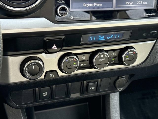 The Tacoma's rugged good looks are further enhanced by the sleek gray exterior, complemented by the black chrome exhaust system and blackout emblem overlays for a bold, distinctive appearance. Inside, you'll find a well-appointed cabin with features like automatic climate control, power windows, and steering wheel-mounted audio controls, ensuring a comfortable and convenient driving experience.